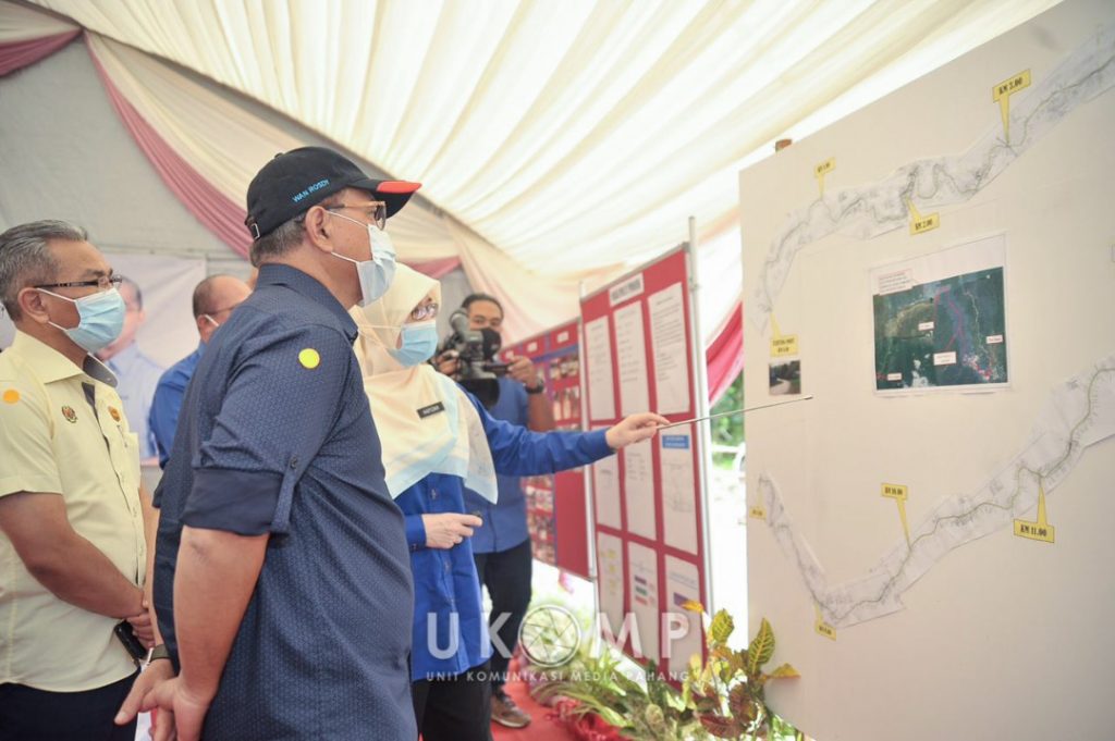 Menteri Besar Pahang, YAB. Dato’ Sri Haji Wan Rosdy Wan Ismail melihat peta Projek Jalan Pos Betau ke Kampung Semoi Lama, Pos Lenjang bagi kawasan Dewan Negeri Jelai, Daerah Lipis hari ini
