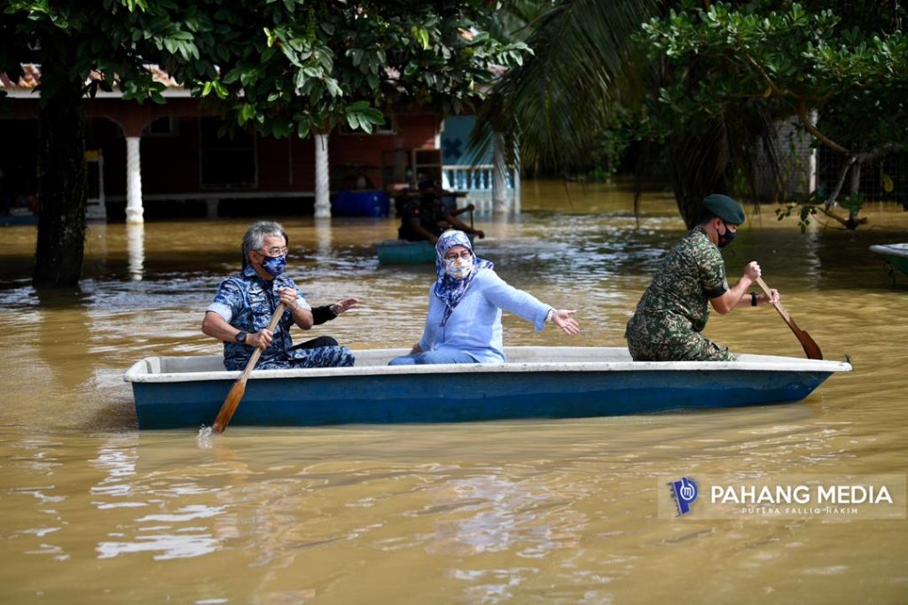 PEKAN , 14 JANUARI 2021: Walaupun dalam keadaan banjir yang masih berarus deras tidak menghalang Kebawah Duli Yang Maha Mulia Seri Paduka Baginda Yang di-Pertuan Agong Al-Sultan Abdullah Ri’ayatuddin Al-Mustafa Billah Shah Ibni Al-Marhum Sultan Haji Ahmad Shah Al-Musta’in Billah untuk mendayung sendiri sampan bagi ke rumah penduduk yang terjejas di Kampung Acheh di sini.