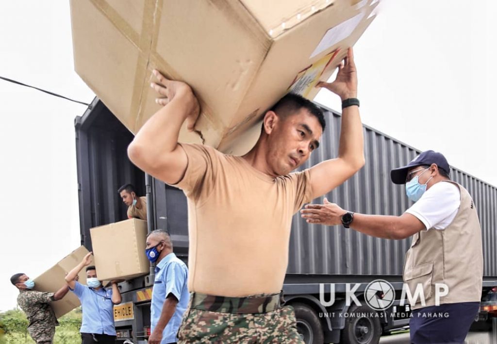 Anggota ATM membantu mengangkat barangan yang disumbangkan oleh YAM Tengku Puteri Lela Wangsa serta adinda-adinda beliau untuk mangsa banjir di Dewan Negeri Bebar, Pekan.